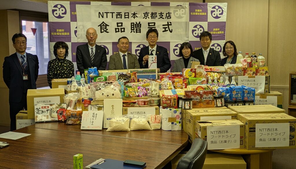 令和7年11月6日(木)、NTT西日本京都支店様より、食材等1,100品を超えるご寄贈をいただきました。