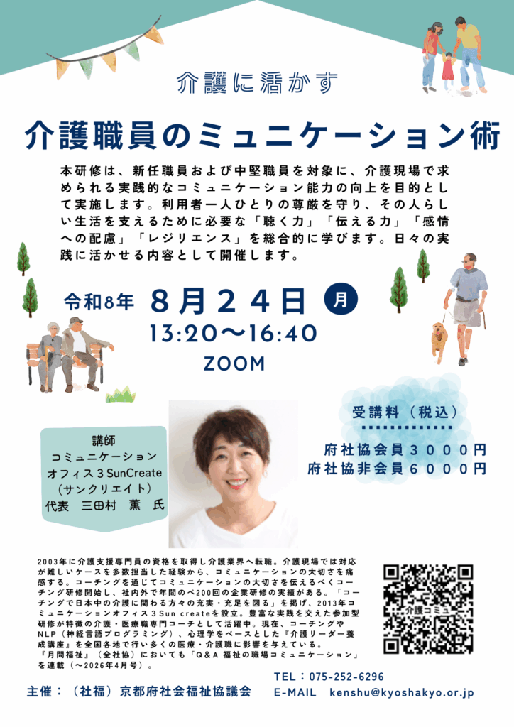 本研修は、主に新任職員および中堅職員を対象に、介護現場において求められる基本的かつ実践的なコミュニケーション能力の向上を目的として実施するものです。利用者一人ひとりの尊厳を守り、その人らしい生活を支えるためには、単なる「技術」にとどまらず、相手の思いや背景を理解しようとする姿勢と、信頼関係を築く力が不可欠です。特に介護現場では、認知症や身体機能の低下、精神的な不安など、さまざまな要因により意思疎通が困難な場面が多く生じます。そうした状況において、職員が適切な関わり方を身につけることで、利用者や家族の安心感や自己決定の支援につながり、結果としてケアの質の向上や職員自身のストレス軽減にも寄与します。本研修では、「聴く力・伝える力」「感情への配慮」「アサーション」などを総合的に学び、日々の実践に活かせるコミュニケーションスキルの習得を目指します。新人にとっては基礎固めとして、中堅職員にとっては自己の関わりを振り返り、専門性を再確認する機会とすることを目的として開催します。