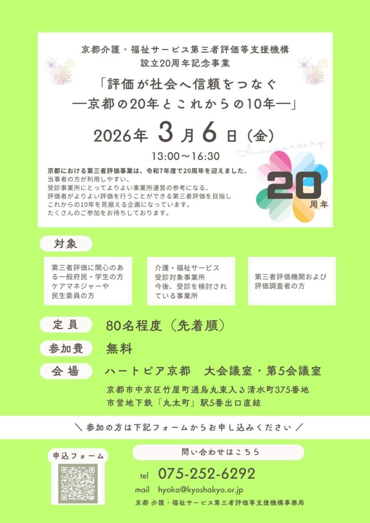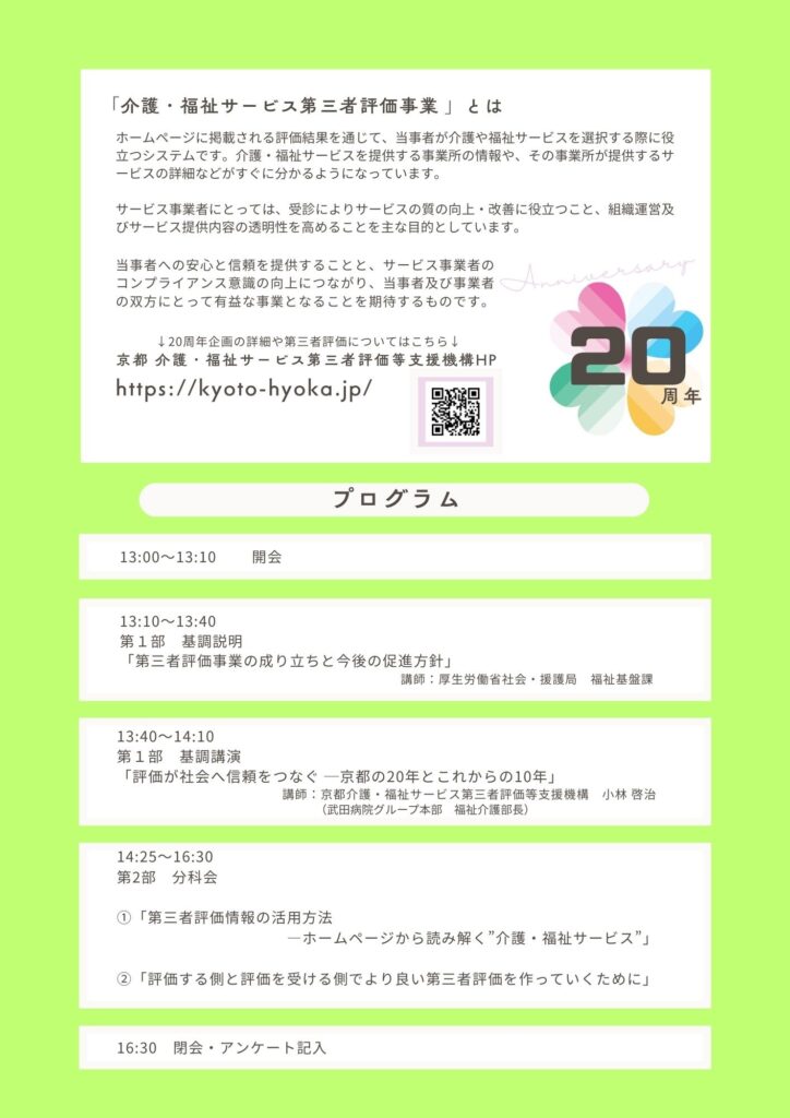京都介護・福祉サービス第三者評価等支援機構(事務局:京都府社会福祉協議会)では、平成17年度より、京都府内の福祉サービスの質の向上を目指し、第三者評価を実施してきました。